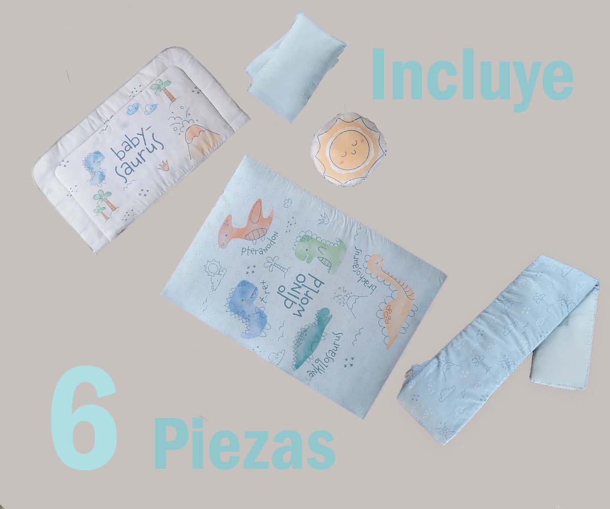 1 Cabecera 0.75 mx 0.45 m 1 Cojín 0.30 mx 0.30 m 1 Edredón 1.00 mx 1.45 m 1 Funda de almohada 0.40 mx 0.27 m 1 Protector de barandal 0.24 mx 3.50 m 1 Sábana de cajón 0.70 mx 1.40 mx 0,13 metros