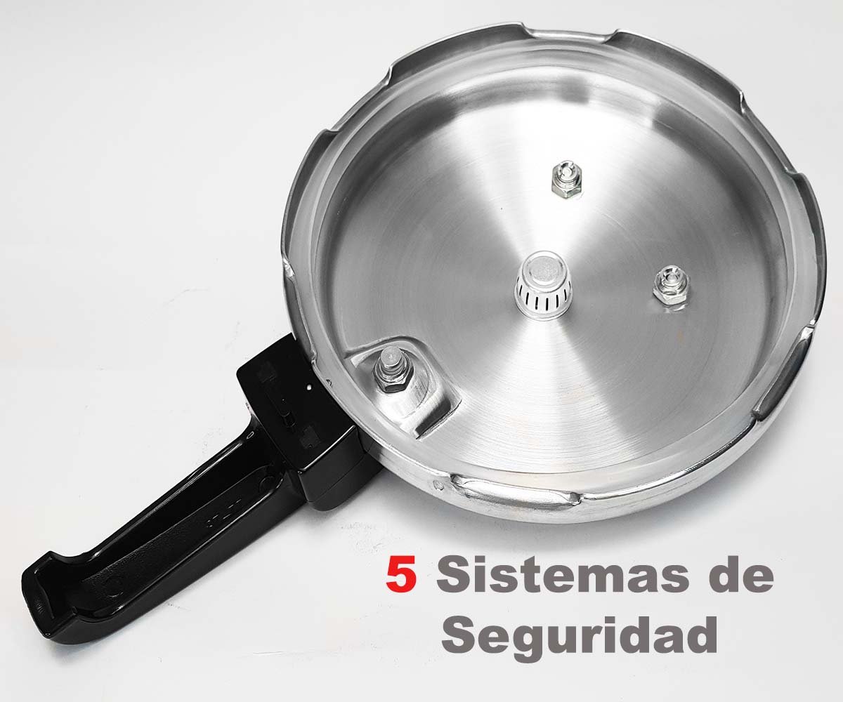 1)Sensor de Presión: Está cerca del mango de la olla, en el momento que la olla empieza a generar vapor o presión en su interior, el sensor sube y nos impide abrir la olla por un descuido. 2) Válvula de Seguridad Principal: Es la válvula que va en el centro, con una chimenea y un peso que lleva en su interior un alambre de seguridad para que al sentir la presión no se caiga. Es la que libera la presión constante y libera el vapor sobrante. 3) Válvula de Alarma: Es una válvula que emite un sonido agudo que nos alerta en el caso que se obstruya la válvula principal no libere vapor y nos indica que debemos retirar la olla de la fuente de calor, con calma. 4) Válvula de Seguridad: Es en el caso que las anteriores fallen, entra en acción la válvula de seguridad, libera la sobrepresión y si empieza a funcionar, debemos retirar la olla, con calma. 5) Ventana de Seguridad: Actúa en el caso que todas la anteriores fallen, el empaque se asoma por la ventana para liberar el exceso de presión.