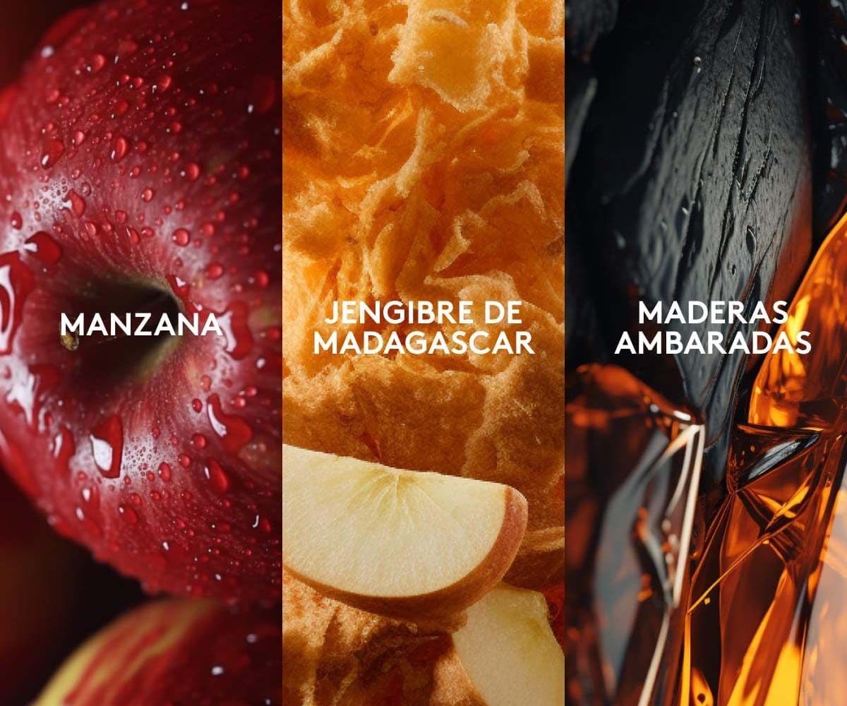 NOTAS OLFATIVAS: Notas de Salida: Manzana, durazno, pomelo, mandarina. Notas de Cuerpo: Cardamomo, canela, jengibre de Madagascar, acorde floral (violeta, iris, flor de naranjo). Notas de fondo: Ámbar, almizcle, vainilla, madera ambarada, cumarina.